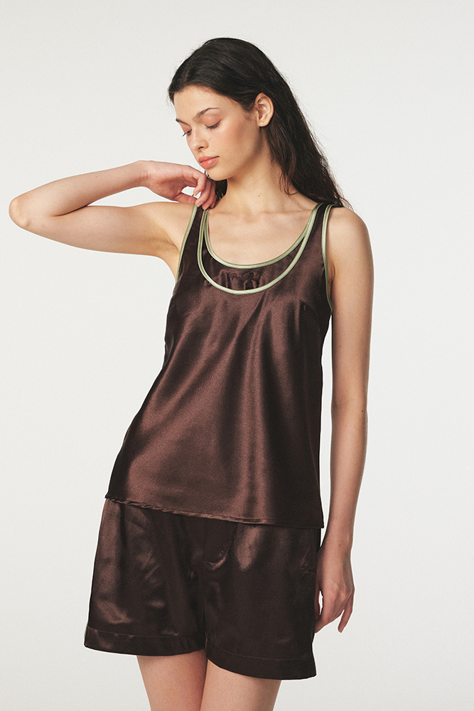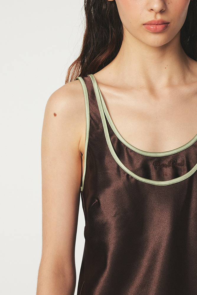 The Pixie layered satin cami: A twist on the classic cami. Pair with Pixie satin boxer and Pixie trouser for full look.