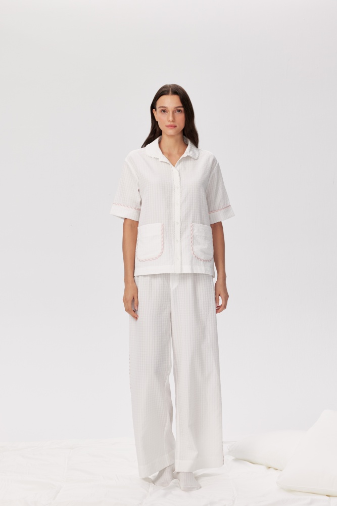 • White base with pink gingham trim