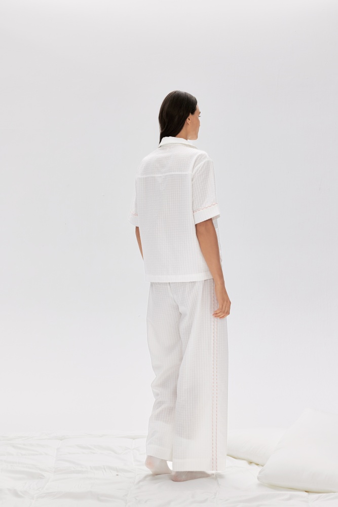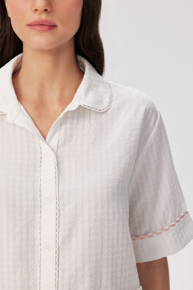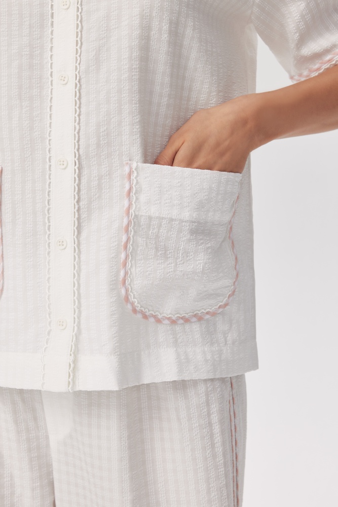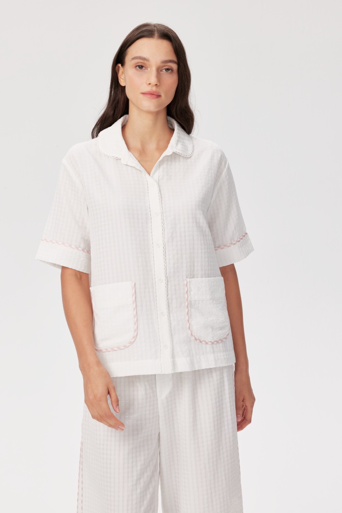 A crisp woven shirt with playful trim details, perfect for elevated daywear. Pair with Shrimpton Trousers for a coordinated look.